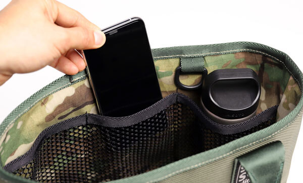 小さめながらも、必要最低限のアイテムをしっかり収納できる実用性。Cuteなサイズ感が特徴で、キャンプ場内での貴重品の持ち歩きや、愛犬とのお散歩バッグとしても最適。小ぶりな見た目とは裏腹に、内側に隠されたカモフラ柄の裏地が遊び心を感じさせます。キャンプチェアから手が届くところにはいつも、私のMini Tote Bag。
