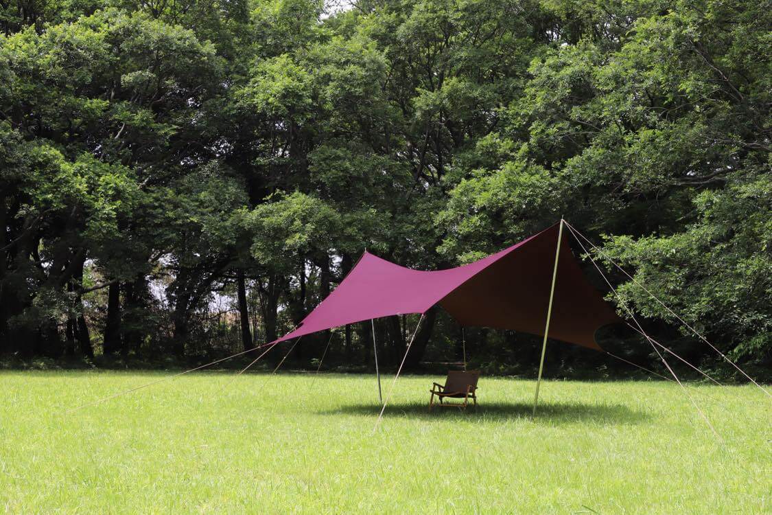 The lustrous burgundy, dyed in a custom color on a high-density fabric woven from Japanese cotton, creates a refined and elegant adult campsite.