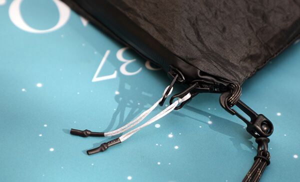 デザイン性を重視し、YKKの止水ファスナー「アクアガード」を採用。ファスナー引き手には、手触りの良いナイロンコードと伸縮ゴムチューブを組み合わせ、アウトドアギアを彷彿とさせるスタイリッシュなディテールに。